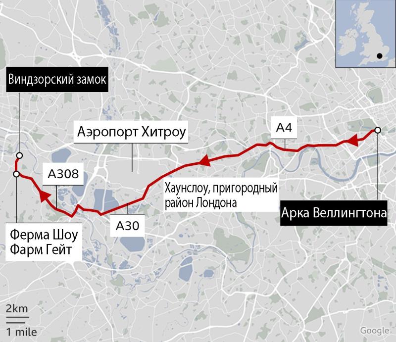 Часть последнего путешествия прошла мимо фермы Shaw Farm Gate, где расположены конюшни с любимыми лошадьми королевы. За 70 лет её лошади выиграли на различных скачках более 600 заездов. Иллюстрация: Google Maps.